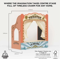 Představte si, že se vaše děti ztrácí ve světě fantazie a příběhů. Toto loutkové divadlo je vyrobeno z kvalitního dřeva s certifikátem FSC a má látkové opony, které dodávají představení autentičnost. Dekorované zlatými detaily a obsahuje i okénko na předprodej vstupenek a popisovací tabuli k uvedení představení. Uvnitř se může otevřít nádherná noční scéna s hvězdami, která vytvoří magickou atmosféru.