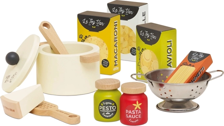 Tato sada na přípravu těstovin obsahuje hrnec s pokličkou, kovový cedník, struhadlo na sýr, vařečku, různě krabičky na těstoviny a dózy s omáčkami, včetně parmazánu. Podporuje rozvoj sociálních dovedností a inspiruje k nápadité hře.
