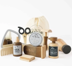 Malí stylisté si zamilují kompletní sadu pro kadeřníky a holiče v kvalitním dřevěném provedení. Praktická bavlněná taška se stahováním ukrývá realistické příslušenství: hřeben, profesionální fén, nůžky, ruční zrcátko, zastřihovač s vyměnitelnými magnetickými čepelemi (magnety jsou skryté pro vyšší bezpečnost), vintage holicí strojek, lahvičku pěny na holení, kelímek na vosk a sprej s mořskou solí.