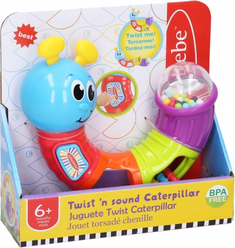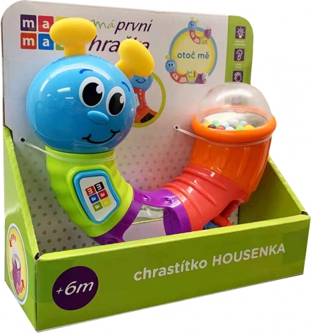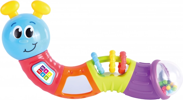 Veselé chrastítko ve tvaru housenky od Maamaa potěší každé miminko. Nabízí několik smyslových podnětů – otáčivé díly, příjemné chrastění a hrkání, pískací tlačítko i bezpečné zrcátko. Ideální velikost 16 cm padne do malých ručiček a podporuje rozvoj jemné motoriky i zrakového a sluchového vnímání.