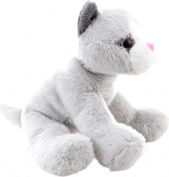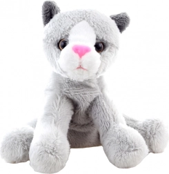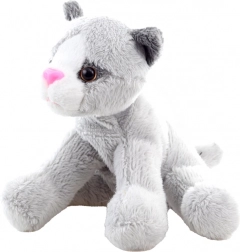 Plyšová kočka v krásném šedém provedení s roztomilým bílým obličejem a růžovým čumáčkem potěší každé dítě.