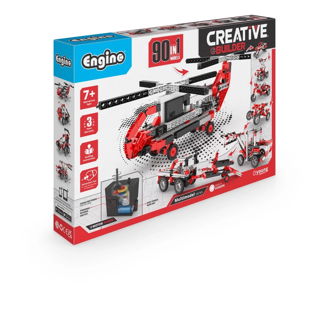 Objevte nekonečné možnosti stavění se stavebnicí ENGINO Creative Builder 90 v 1 s motorkem pro pohon modelů. Z jednoho setu složíte až 90 různých modelů, od aut a motorek po letadla a vrtulníky. Díky interaktivní aplikaci kidCAD 3D můžete modely otáčet, přibližovat a učit se krok za krokem. Vhodné od 7 let, kompatibilní s ostatními stavebnicemi ENGINO.