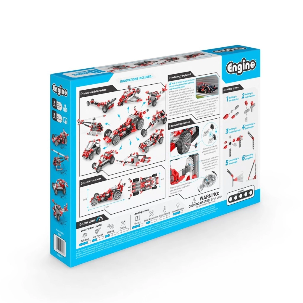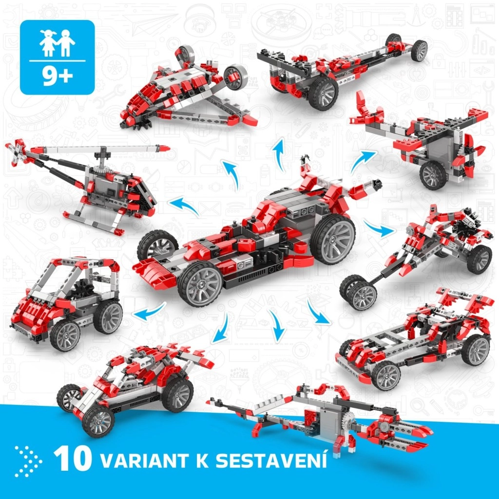 - 10 modelů v jednom – závodní auta, buginy, vrtulník a další stroje.