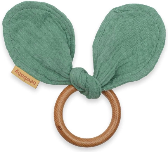 Kousátko New Baby Ears v mátové barvě kombinuje 100% organickou bavlnu a bukové dřevo, což zajišťuje bezpečnost a přírodní materiály pro vaše dítě.