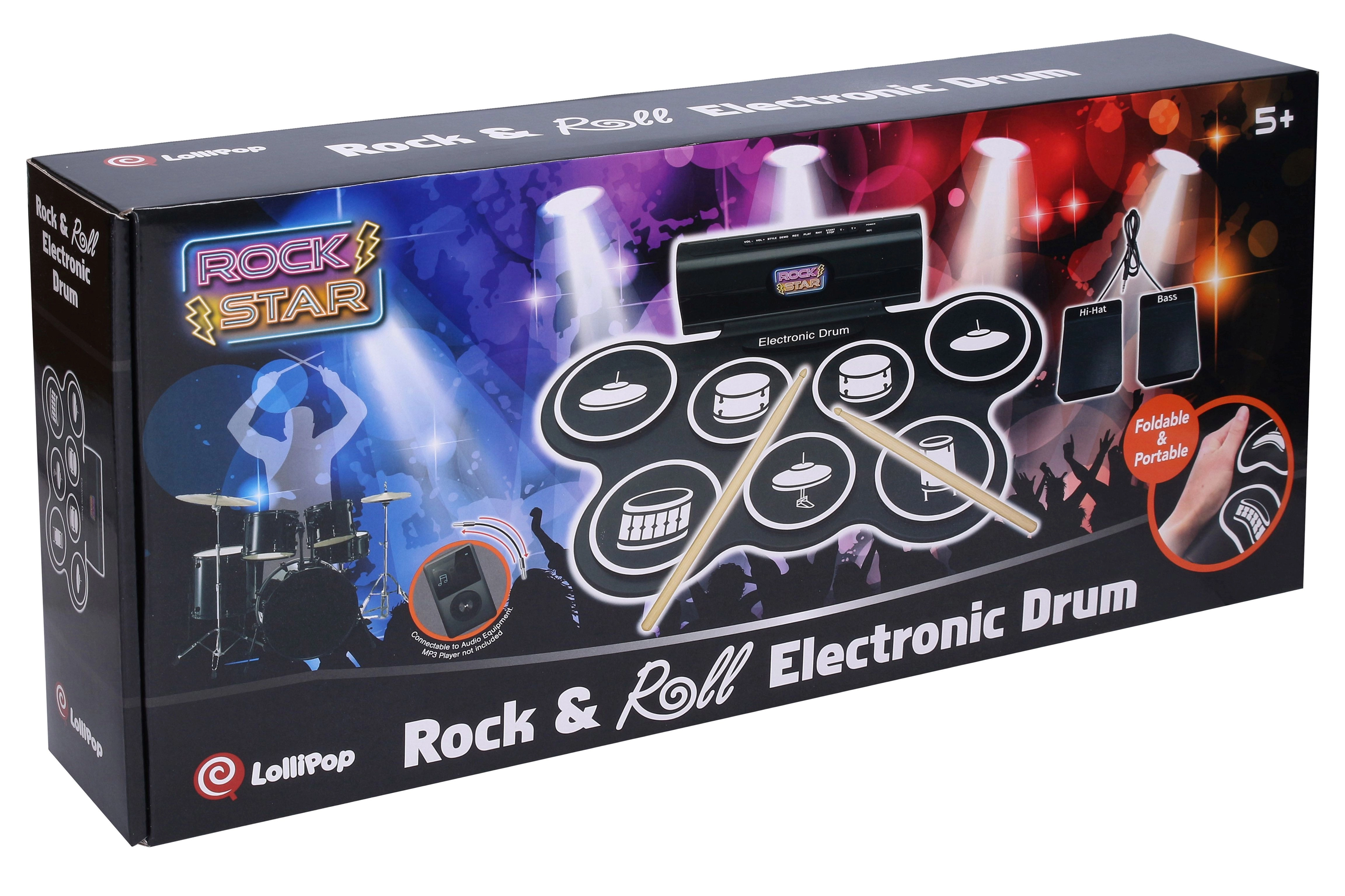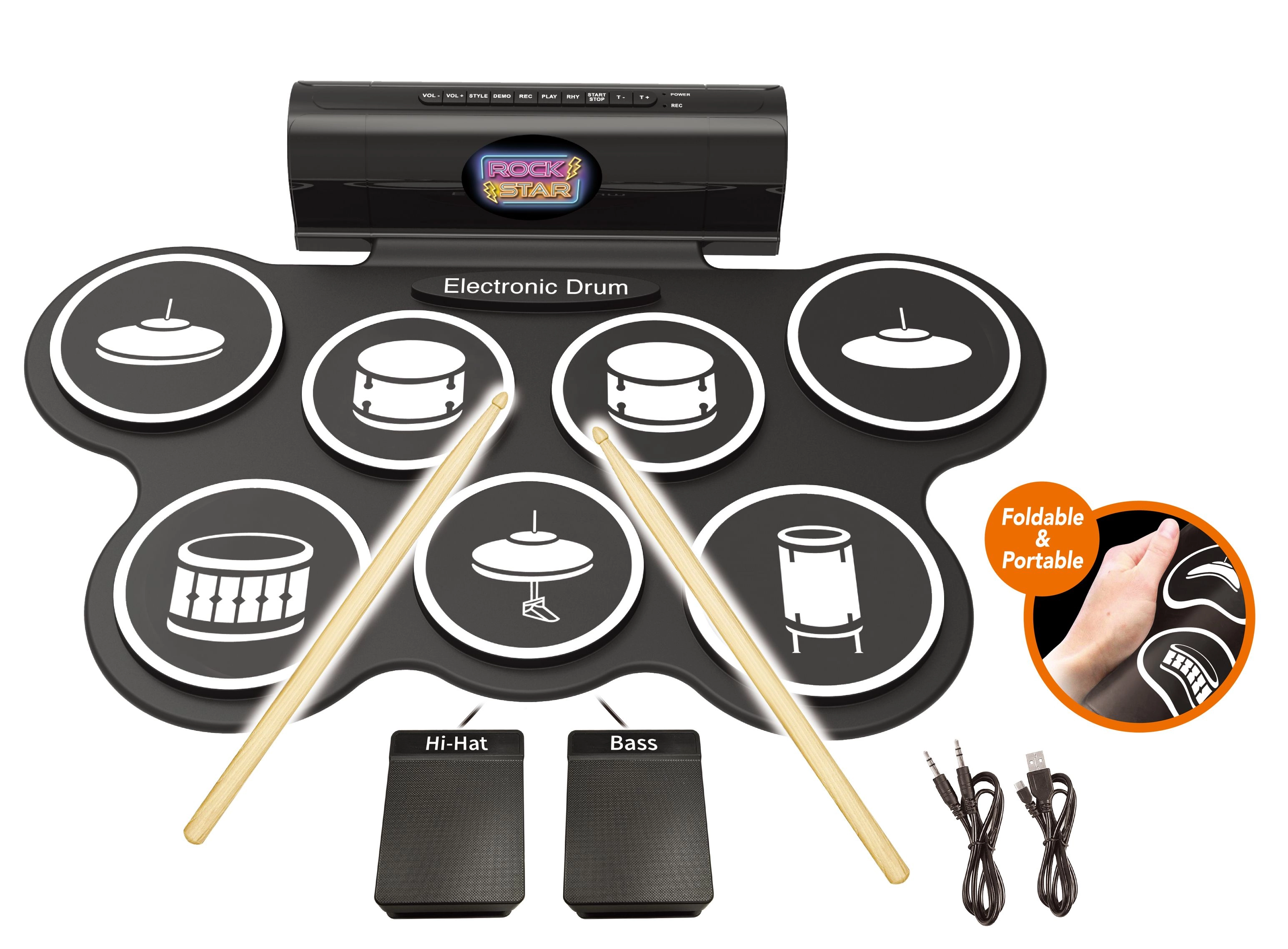 Kompaktní elektronická bicí souprava pro domácí hraní i začátečníky nabízí 7 realistických zvuků, 2 pedály (hi-hat a basový buben), světelné a zvukové efekty a možnost nahrávání a přehrávání. Součástí balení jsou 3× AA baterie, USB kabel i kabel pro mobil/mp3.