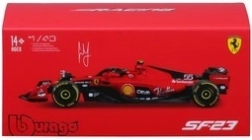 Objevte detailně zpracovaný model FERRARI F1 SF-23 z roku 2023 od značky BBURAGO. Kovové tělo s plastovými doplňky přináší realistické proporce, autentické týmové zbarvení Scuderia Ferrari a startovní číslo 55 pilota Carlos Sainz. Ideální pro vitrínu, pracovní stůl i jako dárek pro nadšené fanoušky královny motorsportu.