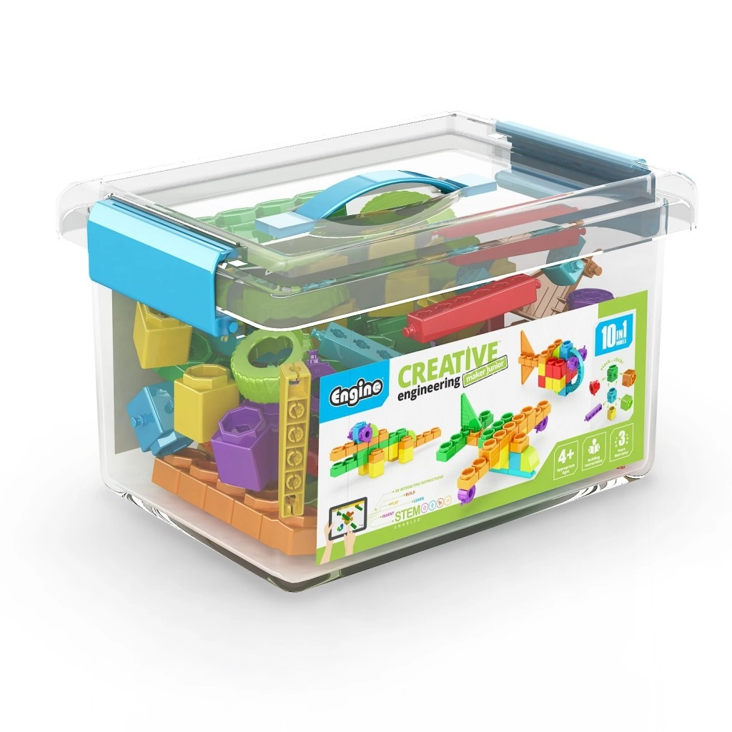 Objevte kreativní svět s ENGINO Box Junior – chytrou stavebnicí s úložným boxem, která dětem od 4 let umožní postavit až 10 různých modelů. Díly se snadno zacvakávají, mají velké, dobře uchopitelné tvary a pestré barvy řady Qboidz. S podporou aplikace kidCAD uvidí děti modely ve 3D, mohou je otáčet a učit se stavět krok za krokem. STEM učení, rozvoj kreativity a jemné motoriky. Kompatibilní s dalšími stavebnicemi ENGINO. Vyrobeno v EU.