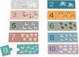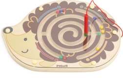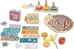 - Magnetický labyrint jež, geometrická skládačka/třídička, dřevěná knížečka (pojazdy), sada ovoce na krájení, puzzle s čísly 1–10, tvarové skládačky