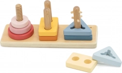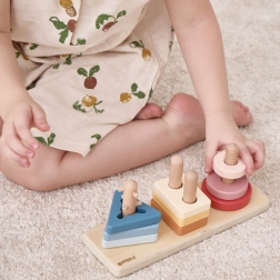 Dřevěné dílky a kolíky učí rozpoznávat tvary a barvy, podporují prostorové myšlení a logické třídění. Ideální pro první kroky v geometrii.