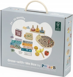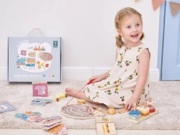 Součástí balení jsou magnetický ježčí labyrint, skládačky a puzzle, sada ovoce na krájení i dřevěná knížečka s dopravními prostředky. Vše je uloženo v praktickém boxu s madlem pro snadné přenášení. Ideální volba pro malé průzkumníky připravené na pokročilejší úkoly.