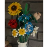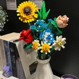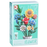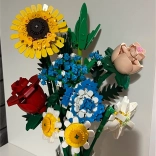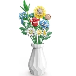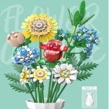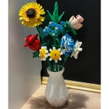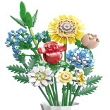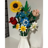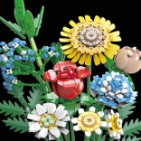 Proměňte stavebnici v designovou dekoraci. Barevná kytice ze stavebních dílků zahrnuje slunečnici, růže, karafiát, sedmikrásku, lilii, pomněnku a zelené doplňky (listy haitong, cedr, tráva). Součástí je i elegantní krémový flakon, takže hotovou kytici můžete hned vystavit na poličku či stůl.