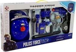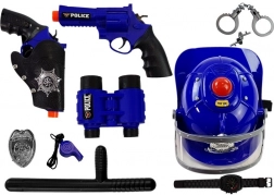 Pistole s pouzdrem, pouta, obušek, vysílačka, hodinky, odznak, píšťalka a dalekohled – vše, co malý policista potřebuje k akci a hlídkování.