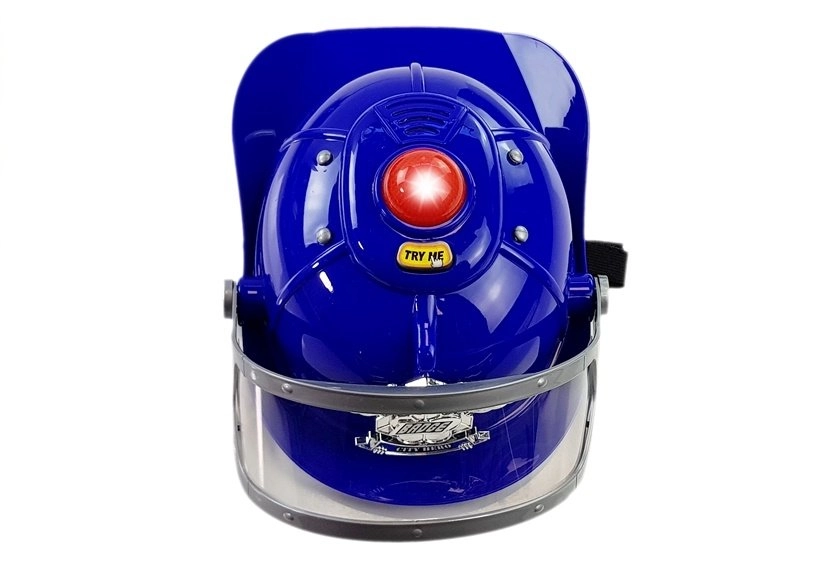 Interaktivní helma na baterie s tlačítkem „Try me“ rozzáří červené světlo a spustí realistické policejní zvuky – dokonalý doplněk pro převleky i hraní rolí.