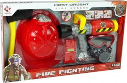 dětský hasičský set s vodní hasicí stříkačkou, maskou a červenou přilbou