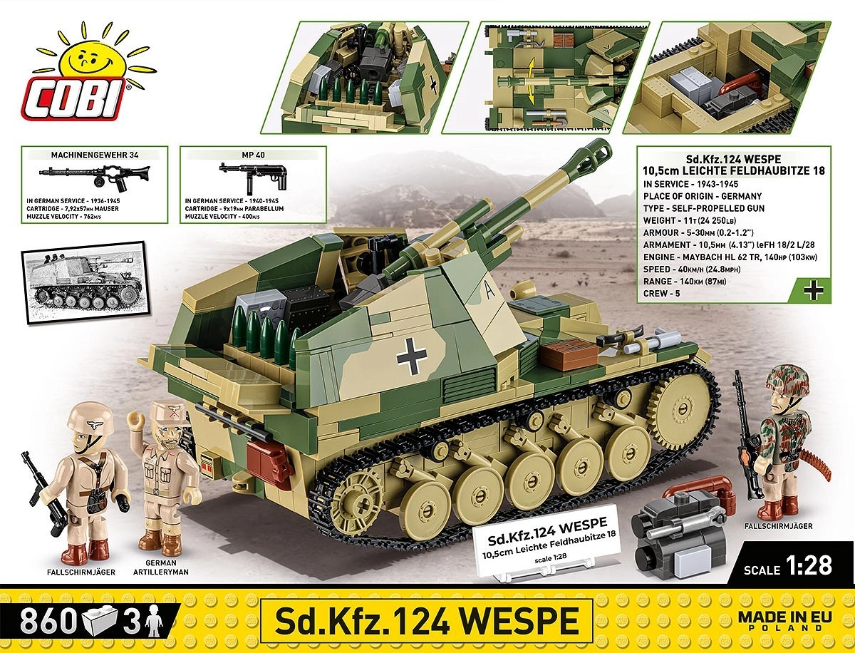 Tento precizně navržený model Wespe na podvozku Panzer II přináší skvělý zážitek ze stavění i vystavení. Vysoká kvalita potisků zaručuje odolnost při hraní, realistické detaily jako vizory, označení a konstrukční prvky (větráky, výdechy) pak podtrhují sběratelskou hodnotu. Rotující prvky, funkční pásy a promyšlené proporce v měřítku 1:28 zvýrazňují autenticitu.
