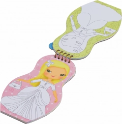 Předkreslené motivy panenky a šatů jsou připravené k vybarvení – děti si trénují jemnou motoriku a cit pro barvy a tvary.