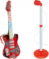 Součástí je bílo‑červený stativ s mikrofonem a praktickým úchopem pro přenášení, takže malý umělec může vystupovat kdekoli. Hra podporuje rozvoj hudebního cítění, rytmiky a koordinačních dovedností.