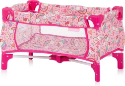 Stabilní rám a kvalitní textilie s motivem jednorožců. Síťované boky postýlky pro lepší dohled a pohodlná židlička pro krmení panenek podporují bezpečnou hru.