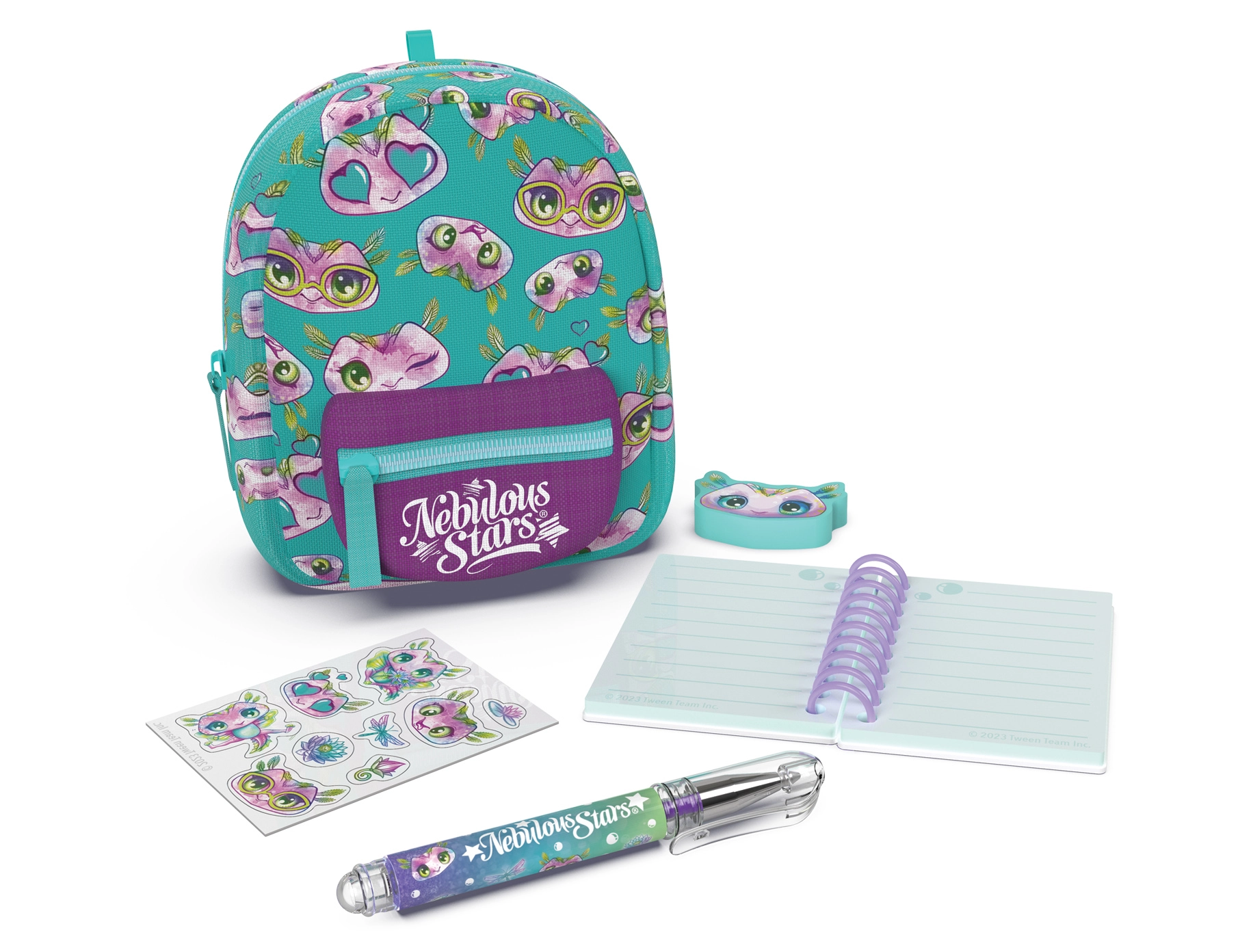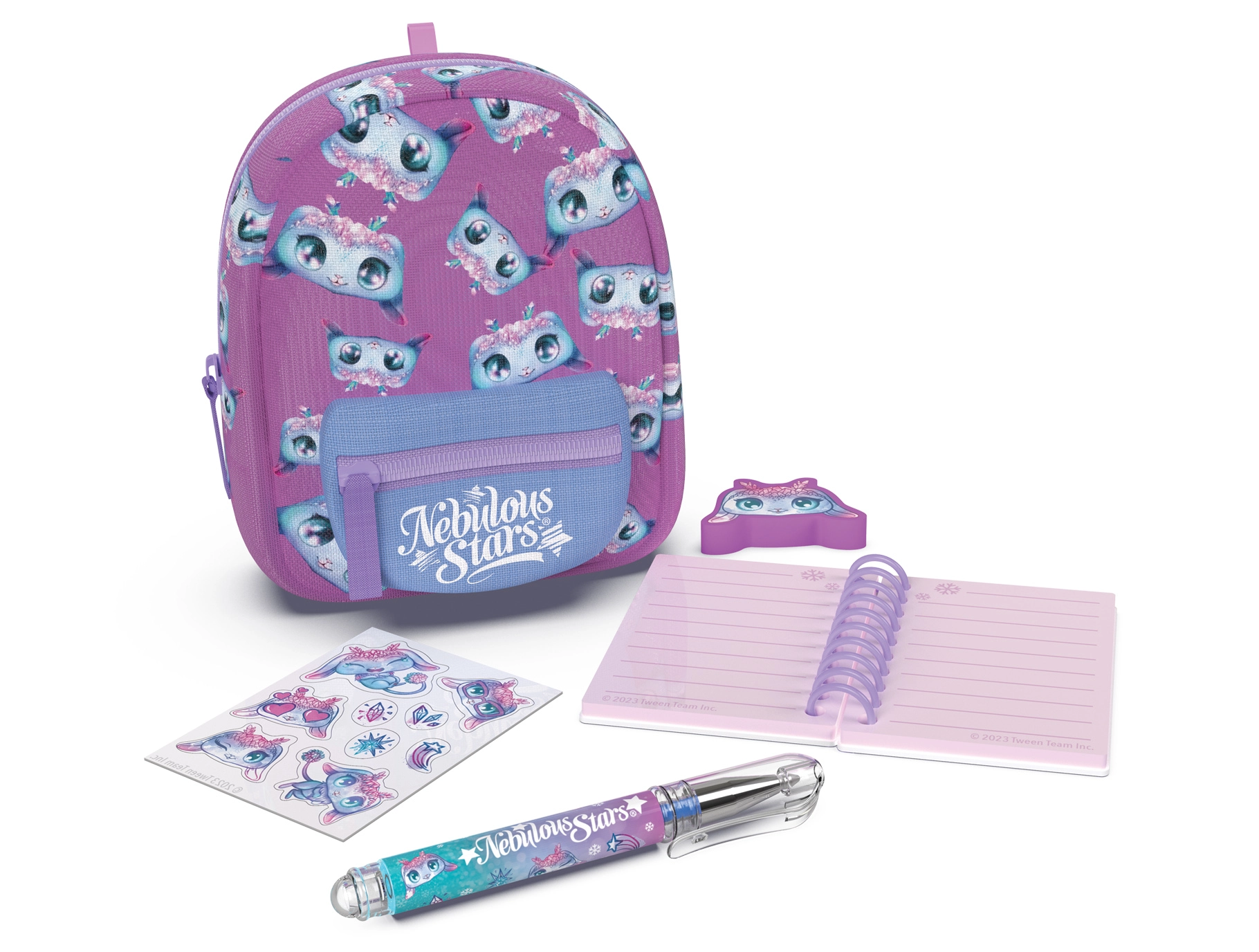 Stylový mini batůžek NEBULOUS STARS se sadou papírnictví je ideální pro malé milovníky tvoření i na cesty. V kompaktním rozměru 9 × 6 × 11 cm ukrývá vše potřebné: linkovaný notes, propisku, gumu, nálepky a roztomilý přívěšek. K dispozici jsou 3 barevné varianty – modrá, bílá a fialová.