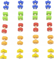 Součástí sady je 40 dílů, tvořených 20 páry šroubů a matic v 5 jasných barvách a tvarech, a také praktická bavlněná taška pro snadné uskladnění.