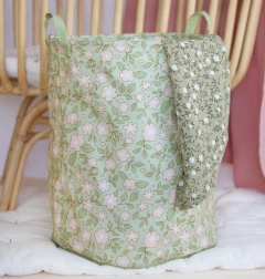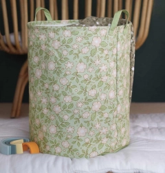 Ozdobte svůj domov tímto košem s nádherným květinovým vzorem na šalvějově zeleném pozadí.