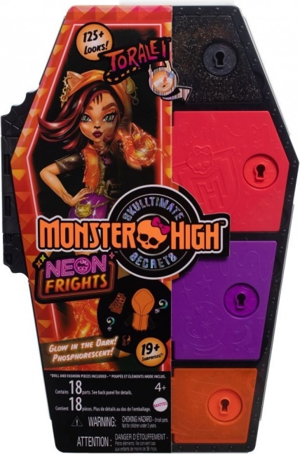 Objevte neonovou sérii Monster High Straszysekrety s panenkou Toralei! Čekají na vás fluorescenční detaily, překvapení ukrytá v přihrádkách, akcesoria svítící ve tmě a zábavné odhalování pomocí Color Reveal. Stylová skříňka ve tvaru rakve slouží k uložení doplňků i k dalšímu hraní.