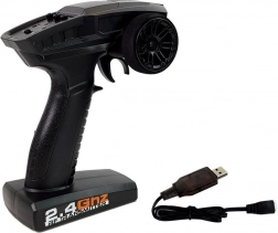 Ergonomický vysílač umožňuje jemné dávkování plynu i přesné řízení. Frekvence 2,4 GHz eliminuje rušení a dosah až 80 m dává volnost při jízdě. Napájení 3× AA (nejsou součástí).