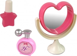 Srdíčkové zrcátko na stojánku, „lak“ na nehty a „parfém“ (imitace) podněcují fantazii a podporují hru na role v dětském salonu krásy.