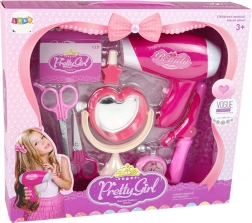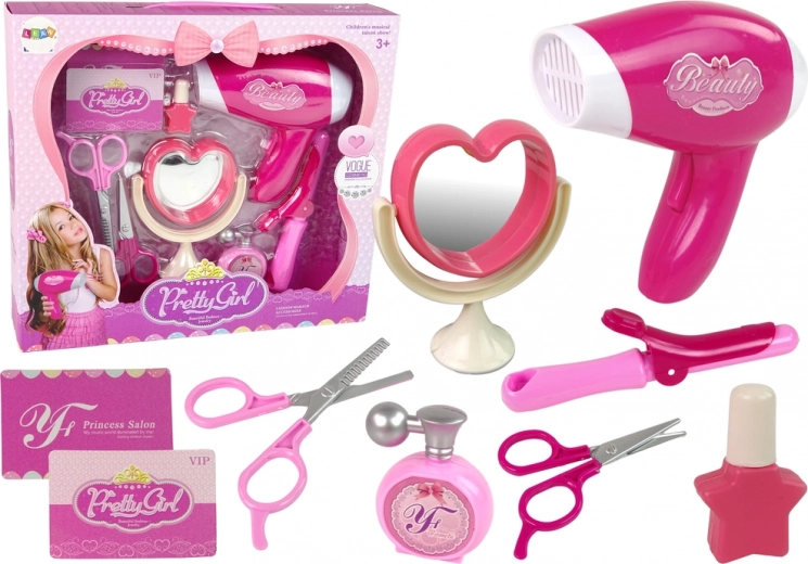 Součástí je srdíčkové zrcátko s podstavcem, imitace kulmy, nůžky a kosmetické rekvizity, díky nimž mohou děti vymýšlet nové účesy i “beauty” rituály. Balení je ideální jako dárek pro malé stylistky od 3 let.