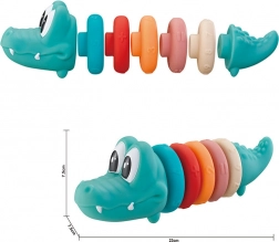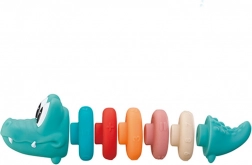 Tato roztomilá pyramida s hlavou krokodýla přináší dětem zábavu i učení v jednom. Barevné kroužky různé velikosti s reliéfními čísly motivují k třídění, navlékání a počítání, čímž přirozeně rozvíjí zručnost a logické myšlení. Měkké provedení je příjemné na dotek a šetrné k dětským ručkám.