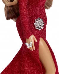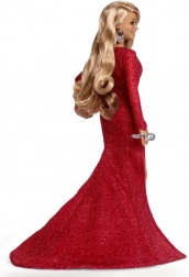 Panenka Barbie Mariah Carey nosí oslnivou červenou róbu, která doplňuje zimní scénérii. Detaily jako řasení na bocích a nápadný rozparek přidávají na její eleganci. Její výrazné kudrnaté vlasy a stříbrné doplňky spolu s červenými podpatky dotvářejí osobitý styl.