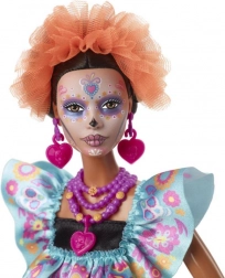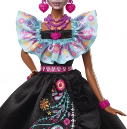 S touto unikátní panenkou Barbie z edice Dia de Muertos 2024 si můžete přinést atmosféru tohoto výjimečného svátku přímo k sobě domů. Panenka je oblečená v sofistikovaných šatech, které kombinují černou saténovou sukni s modrým nařaseným živůtkem a růžovo-růžovým mašloveným páskem. Tyto šaty jsou ozdobeny bohatými výšivkami s motivy kostí, květin a cukrových lebek.