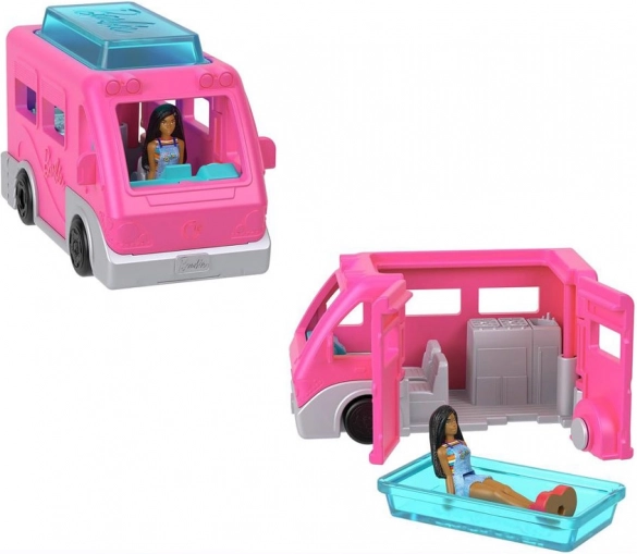 Objevte ikonický cestovatelský styl v mini měřítku. Mini kamper BARBIE DreamCamper překvapí detailním interiérem s kuchyňkou, otevíracími dvířky a chytrým úložným prostorem. Odnímatelný bazének lze připevnit na střechu a díky teplotnímu efektu mění barvu – studená voda barvu změní, teplá ji vrátí zpět.