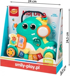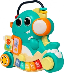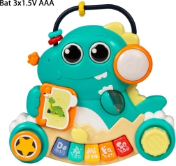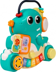 Dítě může posouvat včelku a sleduje, jak dino hýbe očima, nebo otočit kolečko na nožce a poslouchat různé melodie a zvuky. Přepínač režimů umožňuje volit mezi hudebním a zvukovým režimem – ideální pro pestrou a podnětnou hru.