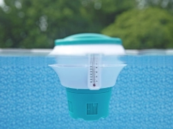 Integrovaný teploměr umožňuje průběžně sledovat teplotu vody, zatímco dávkovač rovnoměrně uvolňuje chemii pro křišťálově čistou vodu.