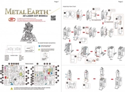 Stavebnice obsahuje 2 ocelové plátky (21 × 11 cm) a podrobný ilustrovaný návod. Jednotlivé díly se vymačkají z plátků a spojují se do zámků pomocí ohýbaných jazýčků – tedy bez lepidla. Pro pohodlnější práci doporučujeme malé štípací kleště/nůžky a jemné ploché kleště (nejsou součástí). Sestavený model měří přibližně 9 × 4,5 × 3 cm a je vhodný od 14 let.