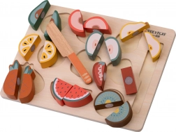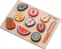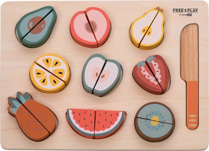 Dřevěná sada Krájení ovoce na prkénku FREE2PLAY je ideální pomůckou pro první kuchyňské hry. Děti se seznamují s různými druhy ovoce, učí se tvary a barvy a bezpečně trénují „krájení“ pomocí dřevěného nožíku. Jednotlivé půlky ovoce drží pohromadě díky suchému zipu a při rozpojení vydávají uspokojivý zvuk, který motivuje k další hře.