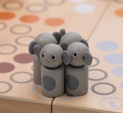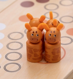 Barevné dřevěné figurky ve tvaru slonů, žiraf, lvů a dalších zvířat dodají hře osobitý půvab a motivují děti k opakovanému hraní.
