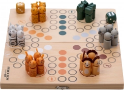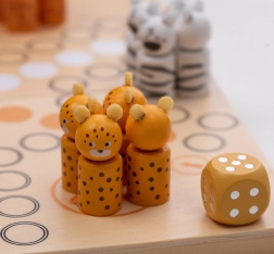 - Dřevěný herní plán/kufřík, 2 hrací kostky, 24 dřevěných figurek ve tvaru zvířátek