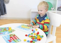 Tato mozaiková hra s velkými, hladkými kloboučky je skvělým způsobem, jak děti zábavně podpořit v rozvoji dovedností. Díky přehledným předlohám a děrované desce se děti učí koordinaci oko–ruka, trénují trpělivost a rozvíjejí fantazii. Velké dílky se dobře drží a bezpečně vkládají.