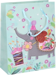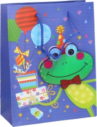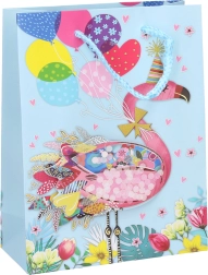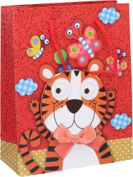 Roztomilá dětská dárková taška velikosti S potěší každého malého oslavence. Nabízí praktický formát 23 × 18 × 8 cm a motivy čtyř oblíbených zvířátek: plameňák, tygr, slon a žába. Ideální pro balení menších dárků, hračky i sladkosti.