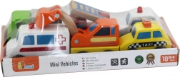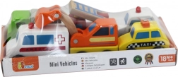 Objevte zábavnou sadu dřevěných vozidel pro nejmenší: taxi, ambulance, bagr, policejní vůz, hasičské auto a nákladní auto. Díky zaobleným tvarům a odolnému provedení jsou ideální pro děti od 18 měsíců. Podporují rozvoj jemné motoriky, fantazii a herní dovednosti při každodenních dobrodružstvích.