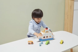 Součástí sady jsou 4 autíčka s volným chodem (cca 6,5 cm) a 2 dřevěné figurky (cca 4 cm), které rozšíří herní scénáře a podpoří rozvoj motoriky, koordinace a fantazie. Díky kompaktním rozměrům je hračka skvělá i na cesty.
