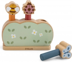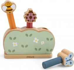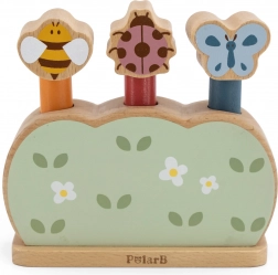Roztomilá dřevěná hračka pro nejmenší s motivy včelky, berušky a motýla rozvíjí jemnou motoriku, koordinaci oko–ruka a princip akce–reakce. Stačí stisknout hlavičku figurek a zvířátka z pružinového mechanismu radostně vyskočí. Kvalitní dřevo, netoxické barvy a lákavé intenzivní barvy dělají z této hračky ideální dárek.