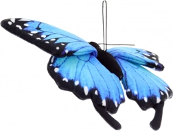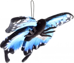Tento plyšový motýl zaujme výraznými modrými křídly s černými lemy a bílými tečkami, které věrně napodobují přírodní vzory. Díky jemnému textilnímu materiálu je příjemný na dotek a bezpečný i pro nejmenší děti (0+). Skvěle se hodí jako dekorace do dětského pokoje nebo jako uklidňující mazlíček pro každodenní objetí.