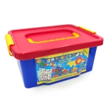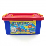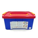 Krabice s červeným víkem a modrou základnou je ideální pro ukládání a přenášení kostek, což pomáhá udržovat pořádek.