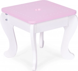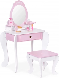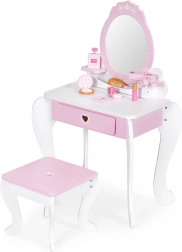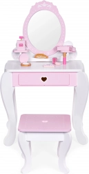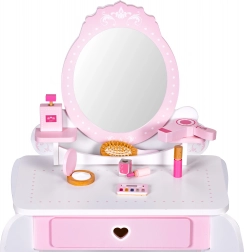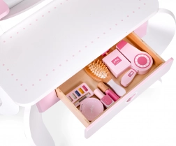 Toaletka je vyrobena z bezpečného dřeva a navržena tak, aby podporovala rozvoj manuálních dovedností a fantazie vašich dětí. Umožňuje i učení základů líčení. Její praktické vlastnosti zahrnují výsuvný šuplík a dvě poličky, které zajistí organizovaný a uklizený stůl.