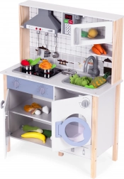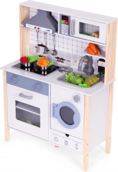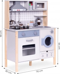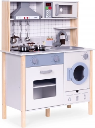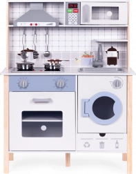 Kuchyňka kombinuje troubu, mikrovlnnou troubu, dřez, pračku a úložné skříňky. Děti mohou současně vařit, péct i ohřívat, po jídle vše umyjí v prostorném dřezu a náčiní zavěsí na praktické háčky. Otevírací dvířka podporují pořádek a rozvíjejí samostatnost a zodpovědnost.