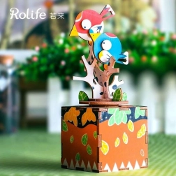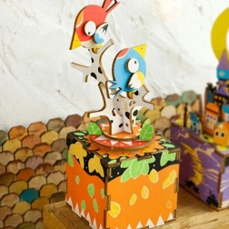 Vychutnejte si stavbu detailního barevného modelu dvojice ptáčků na větvi, který po dokončení oživí vaši poličku příjemným zvukem i jemným pohybem. Kvalitní dřevěné části s přesným potiskem do sebe přesně zapadají a spolu s kovovými prvky tvoří stabilní mechanickou hrací skříňku.