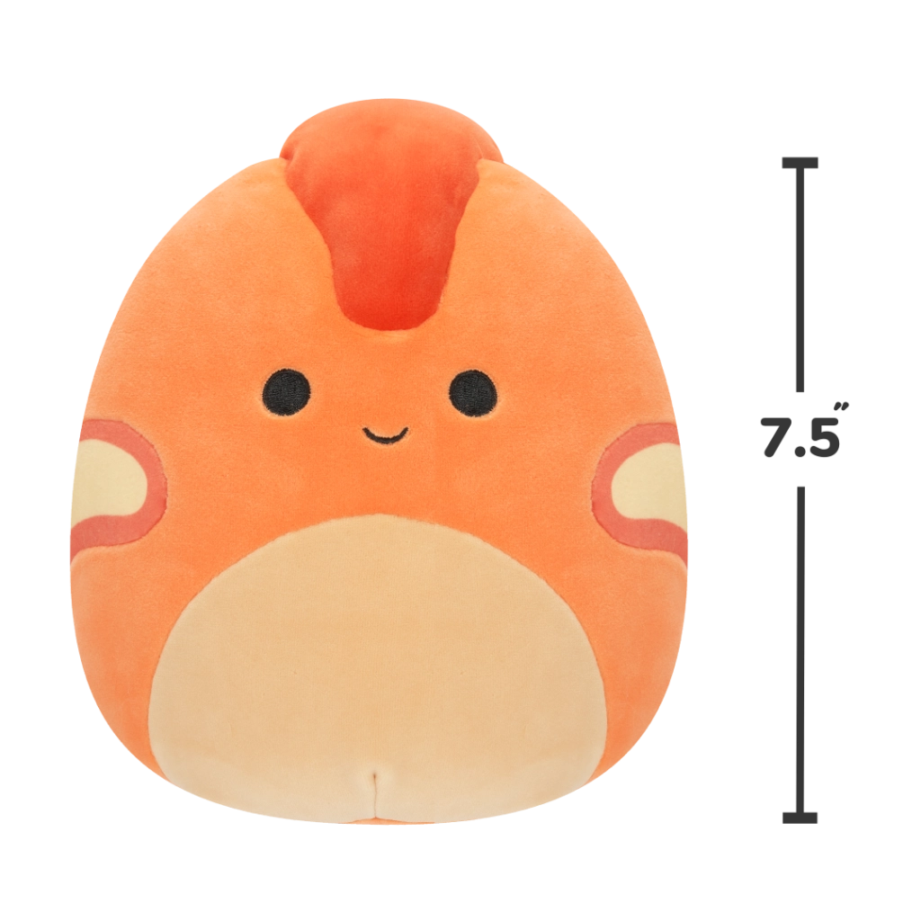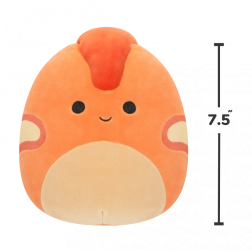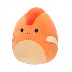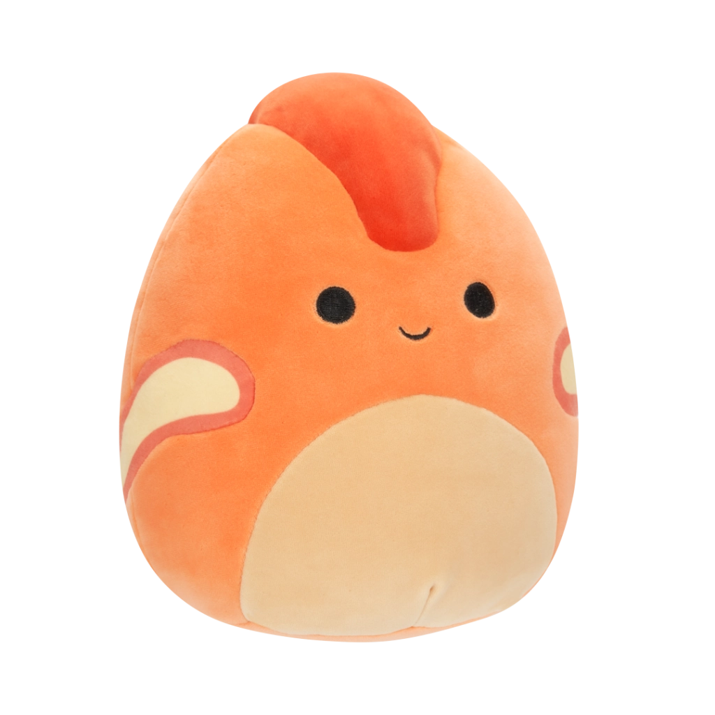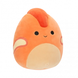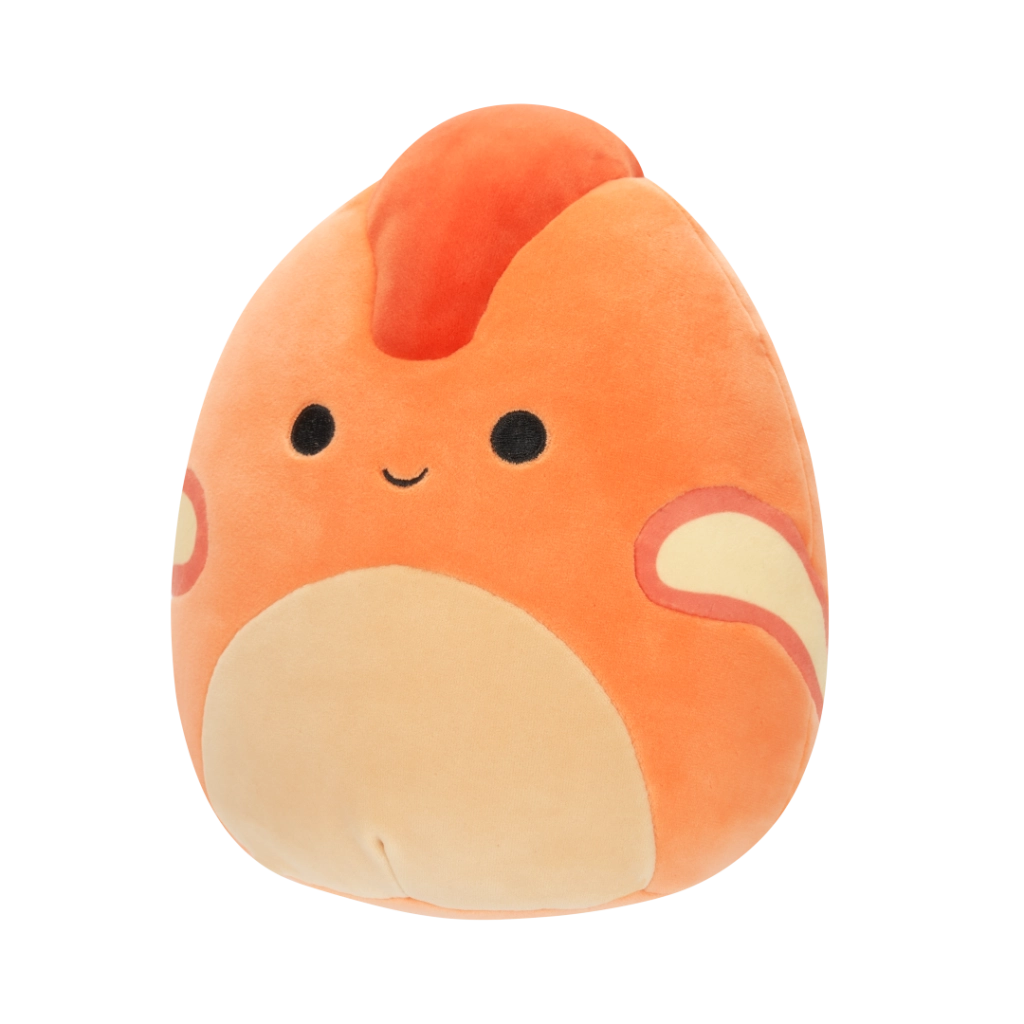 Veselý výraz, oranžové tělo a červený hřebínek potěší děti i sběratele Squishmallows.